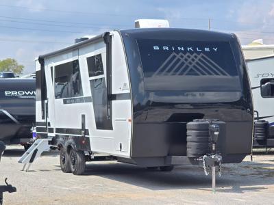 The lightweight Model I travel trailer by Brinkley is the perfect choice for those looking for an easy tow and at-home comforts! There is a drop-frame chassis, high-performance Road Armor suspension equalizer system, and Demco EZ Latch trailer coupler that automatically latches when dropped onto a hitch ball without the need of a safety pin. Additional exterior features include square Euro frameless windows, automotive-grade paint, full-width LED strip lighting in the pass-thru, and a pet & property security campside tie-down to keep your gear and furry friends safe. Inside, you'll be wowed by Brinkley's CraftSense wood trim construction, residential solid surface kitchen countertops, dimmable bedroom lights, and marine-grade neon LED shower lighting to name a few stand-out features!