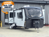 The drop frame chassis will provide a smooth tow from home to campground, and the one-touch automatic leveling system will have you set up in no time. You will love the sleek styling with automotive-grade exterior graphics, along with the square Euro frameless windows with 6" openings. Inside, there are premium residential cabinet and drawers, solid surface countertops, Brinkley's CraftSense wood trim construction, and many more premium features.
