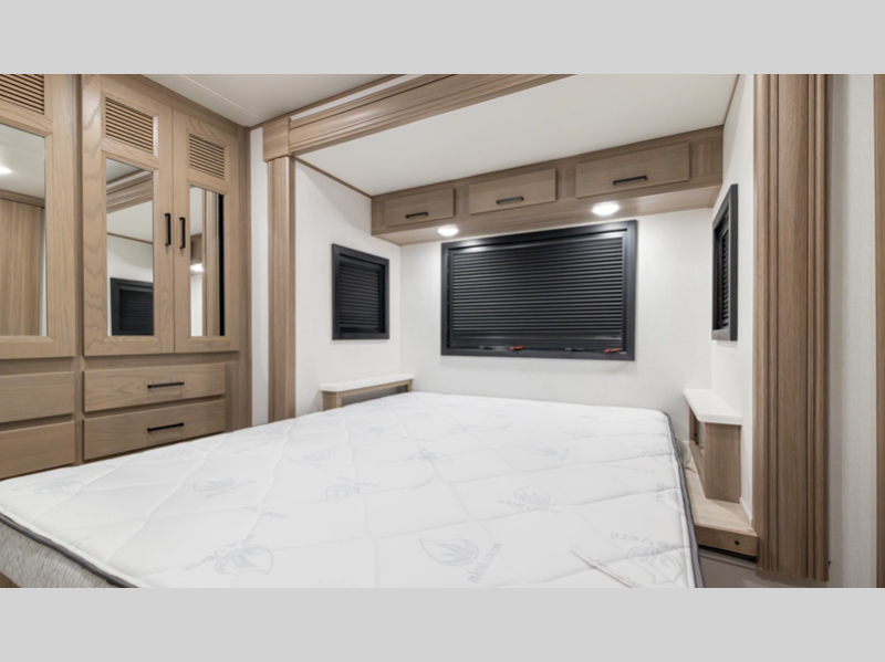 You'll love the bright interior, solid surface countertops and hardwood cabinet doors and drawer faces. There is a spacious shower and a tankless water heater for added comfort, and the 8,000W diesel generator plus 50 Amp service will keep you powered up. Outside, the 4-point hydraulic leveling will have you set up at camp in no-time, and there is a legless Girard awning with an LED light strip so you can relax outdoors in comfort.