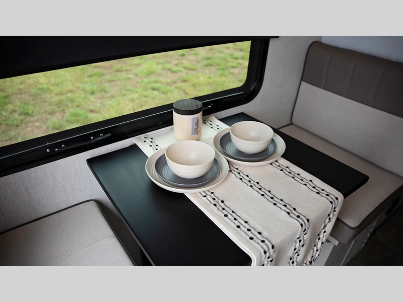 The one-piece Luxe vinyl flooring and aluminum cabinetry will be easy to clean, and there are sleek solid surface countertops. You will also find Tweed interior walls with Azdel, USB charging ports to keep your phone charged, plus an AM/FM Bluetooth stereo so you can listen to your favorite tunes.