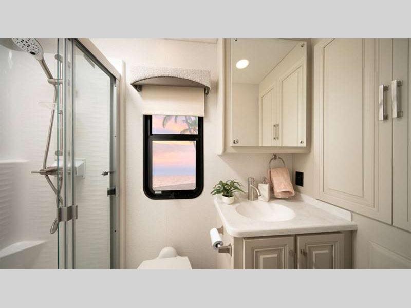 Each unit is held together with a Freightliner S2RV chassis, a one-piece, crowned fiberglass roof, and TuffShell vacuum-bond laminated sidewalls, plus they are powered by a Cummins ISB 6.7L engine. The exteriors are full of conveniences like a shower, utility center, an entertainment center, and a carpeted, full pass-through storage compartment with lockable slam latch doors to keep your outdoor gear! The interior will feel just like home with raised panel hardwood cabinetry and porcelain tile flooring, and the Firefly Multiplex system will let you control all your coach's function with ease.