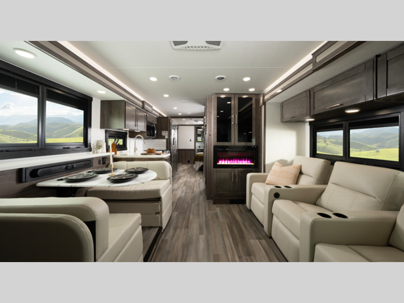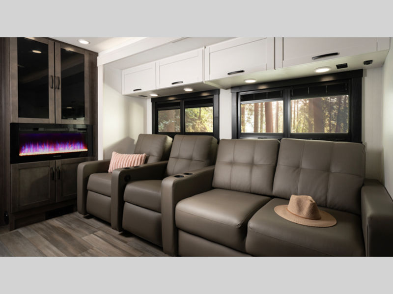 - E-Z Drive™ Elite; 15,000 BTU A/C unit with heat pump and second 13,500 BTU A/C unit; Exterior entertainment center; Electric patio awning with LED lights; Slideout cover awnings; Onan® 5,500W generator; 1,200W inverter; 50-amp electrical service; 10 gal. gas/electric water heater; Sony® infotainment center; Backup and side-view cameras; Removable driver/passenger cockpit table; LED-lit solid-surface countertops, LED HD Smart TV in living area; Integrated day/night cassette shades