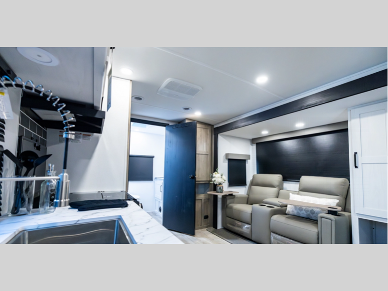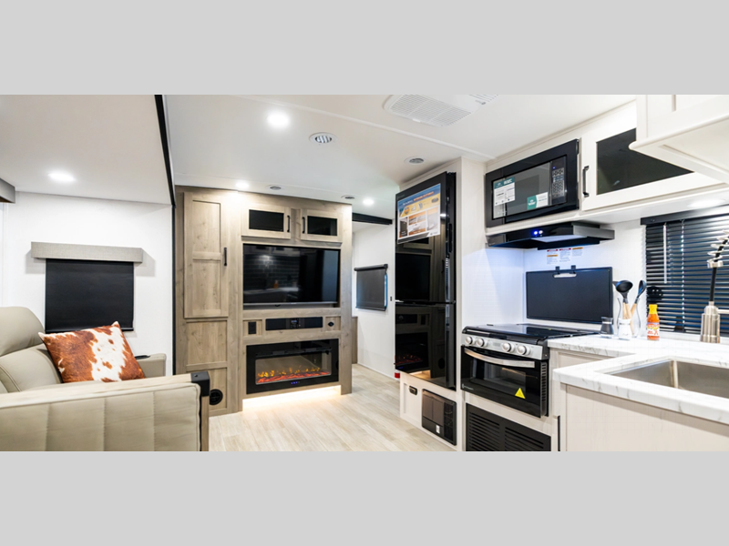 Sleeps 4 Slides 3 Length 36 ft 10 in Ext Width 8 ft Ext Height 11 ft 1 in Hitch Weight 1015 lbs Dry Weight 7693 lbs Cargo Capacity 1950 lbs Fresh Water Capacity 42 gals Grey Water Capacity 76 gals Black Water Capacity 38 gals Available Beds King Refrigerator Type Electric Refrigerator Size 11 cu ft Shower Size 30" x 48" Number of Awnings 1 AC BTU 15000 btu TV Info LR TV Awning Info 21' Power with LED Lights Axle Count 2 Washer/Dryer Available Yes Shower Type Standard Electrical Service 50 amp Solar Wattage 200 watts Similar Floorplans