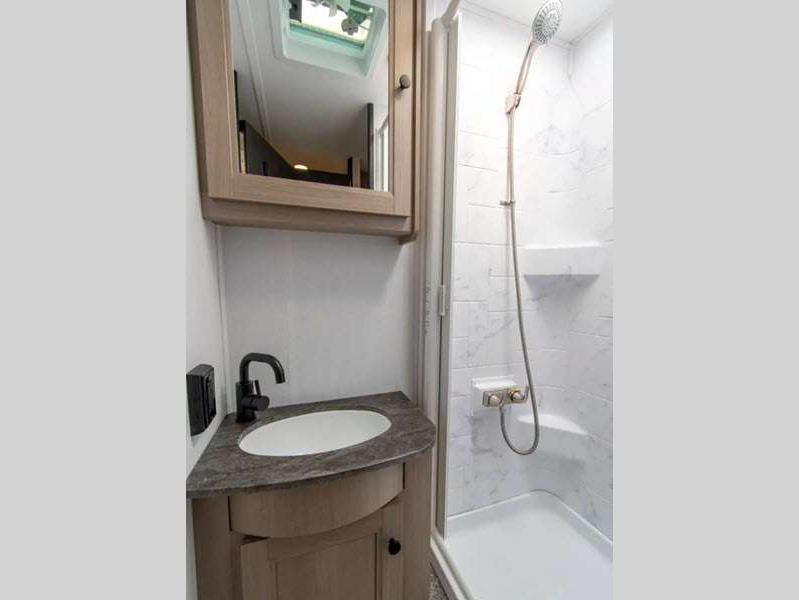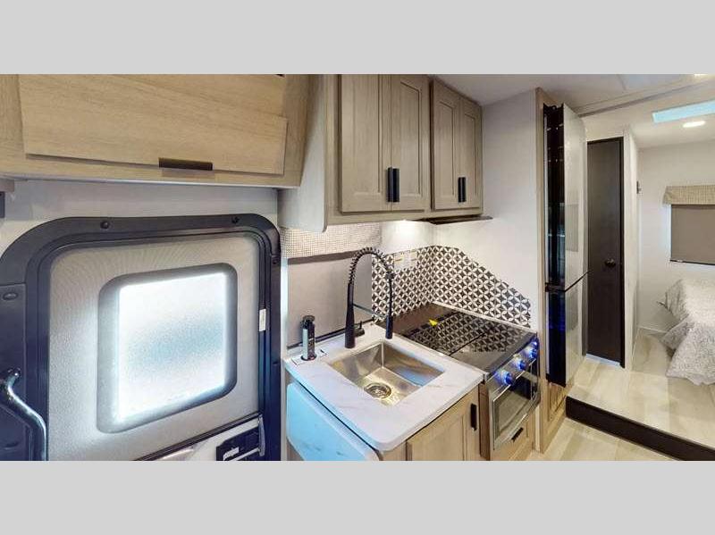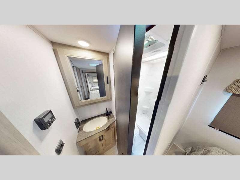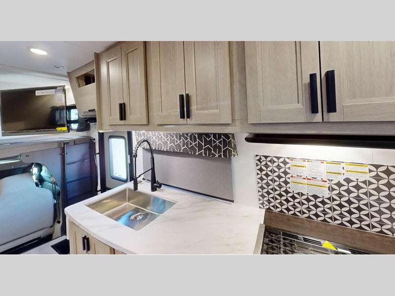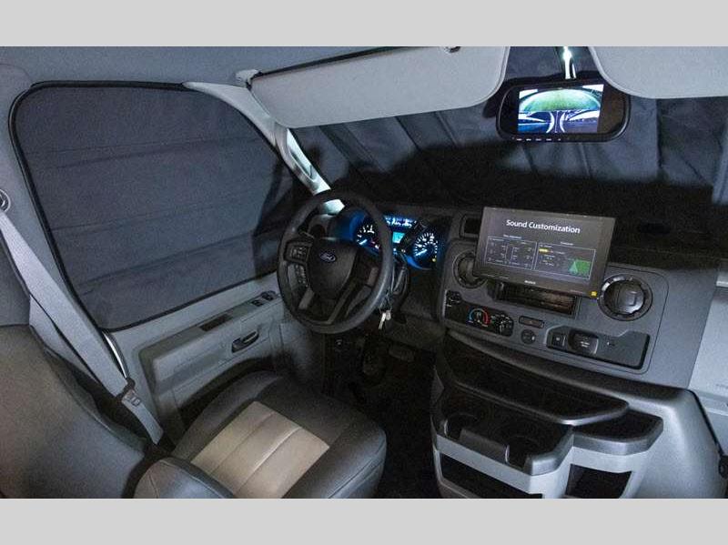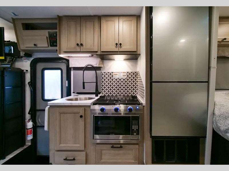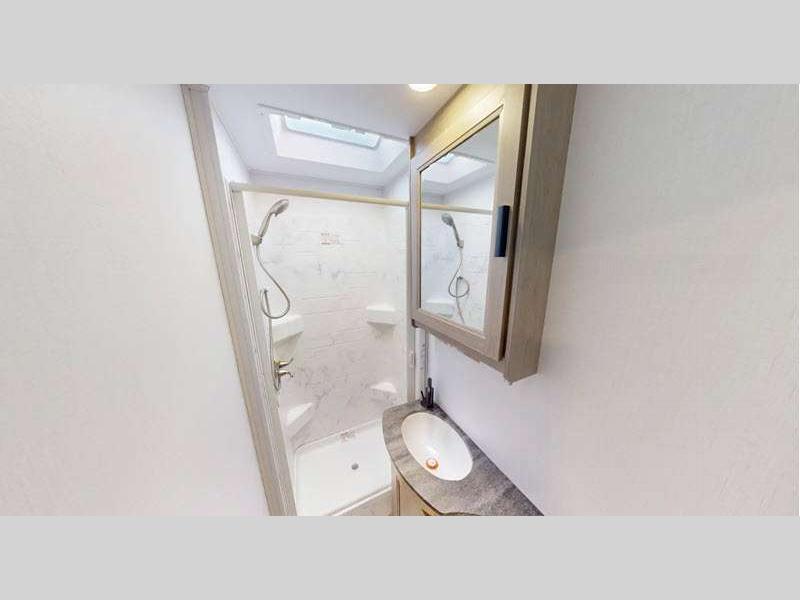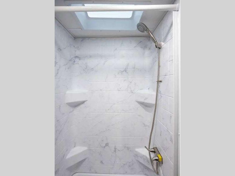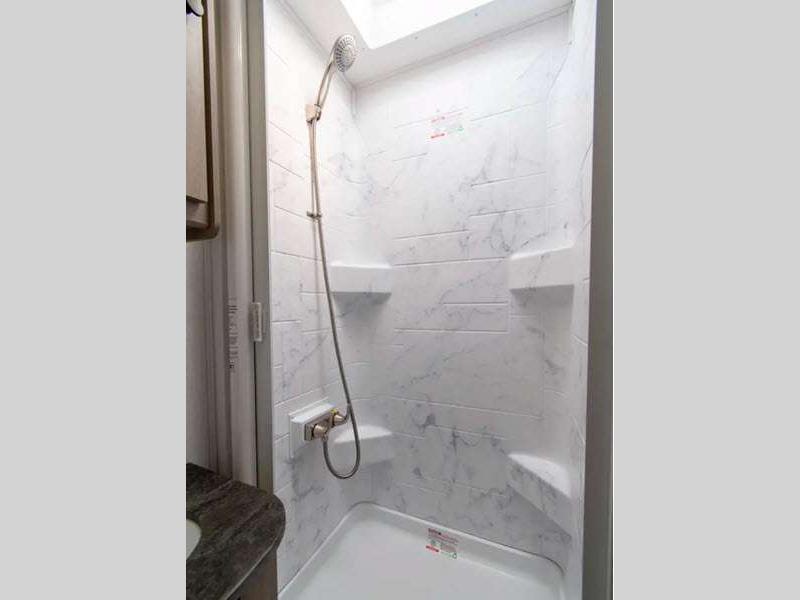 The exterior consists of a fiberglass roof, a one-piece seamless fiberglass cap, slide-out awnings, an integrated entry step, and 2"aluminum framed lamited sidewalls with lightweight composite waterproof material. The sideview and backup cameras will help you park your coach, and the high-pressure oxygen-infused shower head will give you a pleasant shower experience. You'll also have a Maxx Air multi-speed power fan with cover in the kitchen, and another kitchen feature you'll love is the 1.3-cubic foot convection microwave. You also have the ability to add an optional solar-powered 12V charging system.