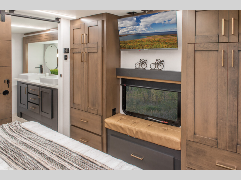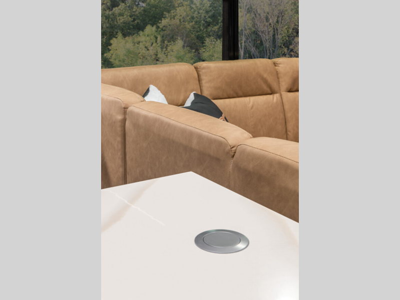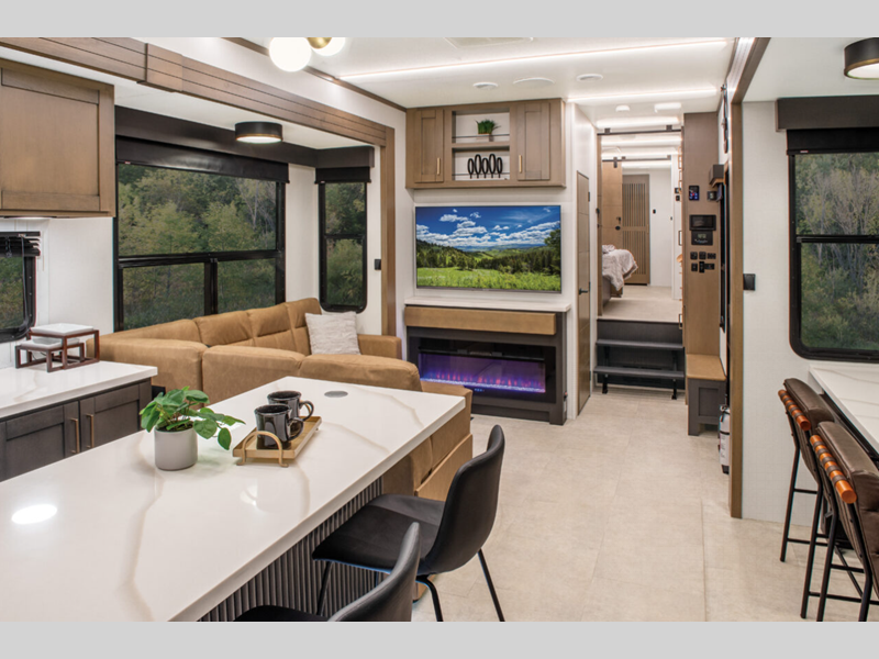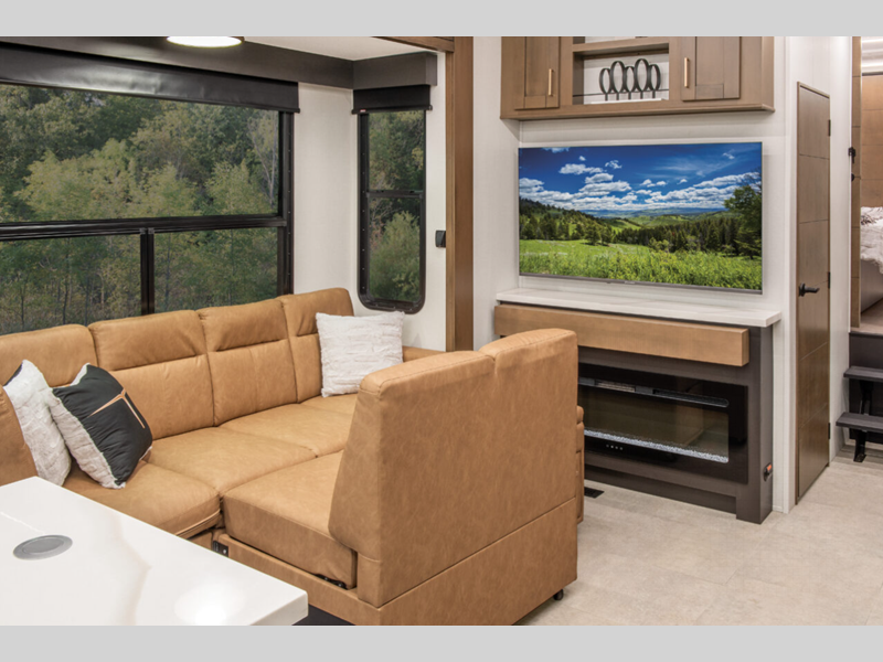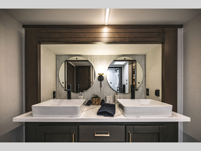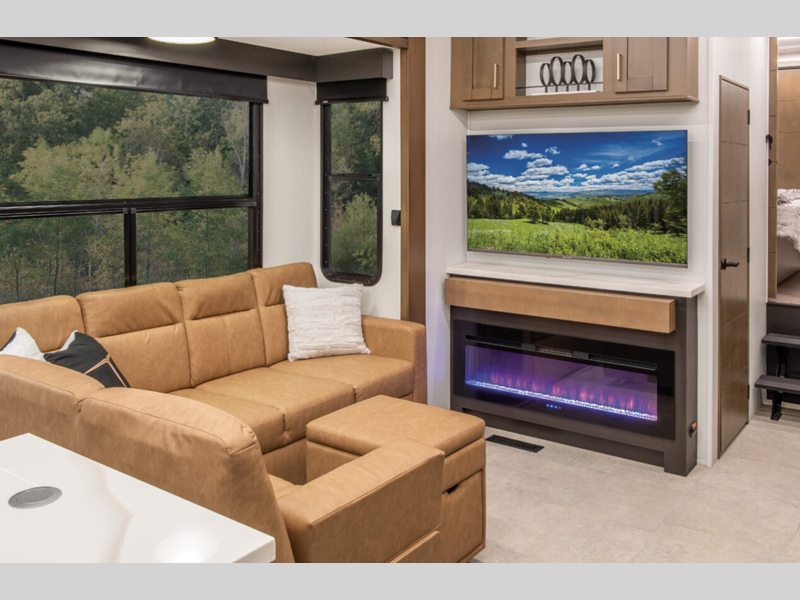 Each Bighorn is packed with luxury features. Head inside to find Bighorn Custom hardwood cabinetry, solid surface countertops throughout, tinted frameless windows, a luxurious one piece fiberglass shower, oversize copper sink with roller cover, and the list goes on. There is an instant on-demand water heater, a triple high efficiency A/C’s with trio airflow A/C system to evenly cool your unit, plus a LED fireplace w/ 5,000 BTU electric heat for cold days. You will find it effortless to set up camp with the 6-point hydraulic leveling system, and the docking and utility center will make camping that much easier.