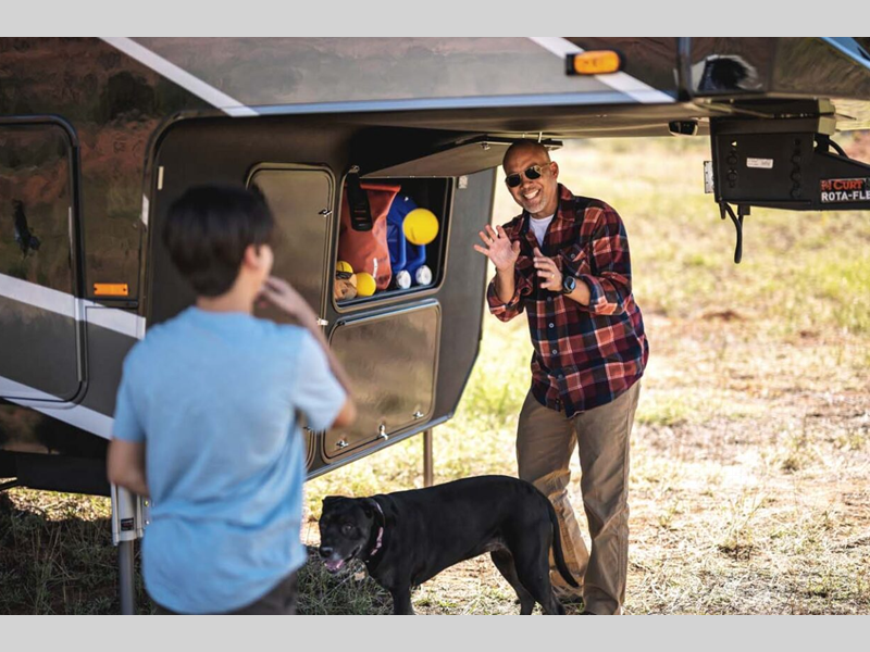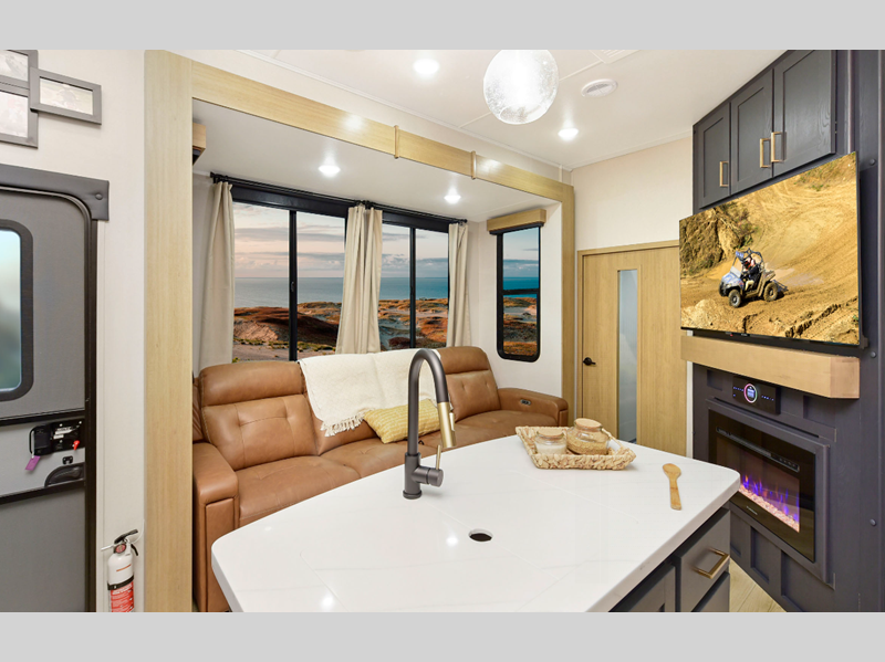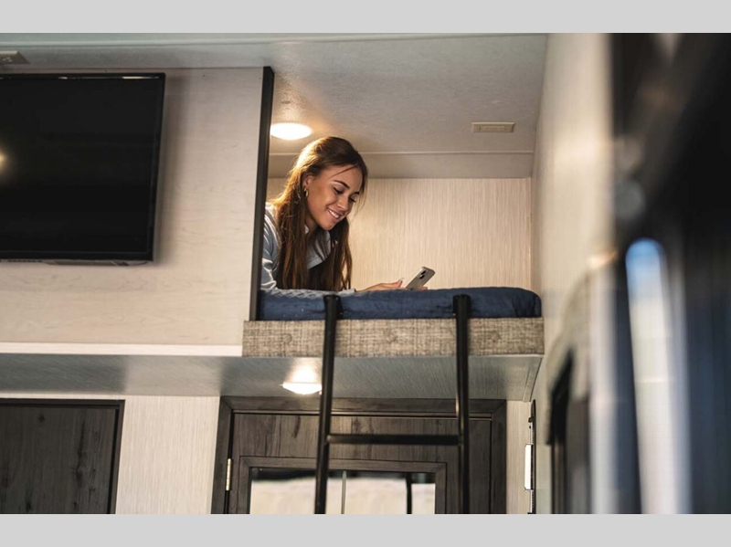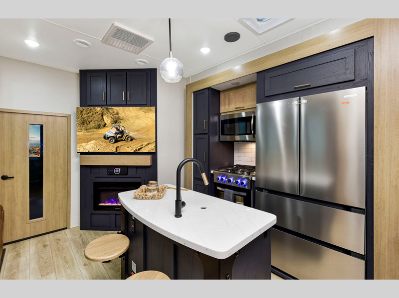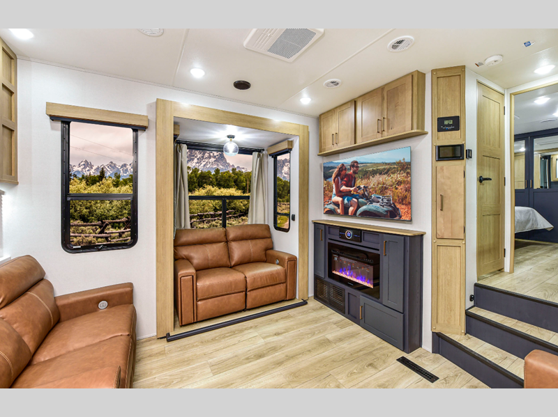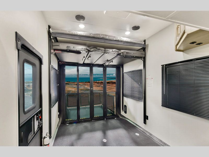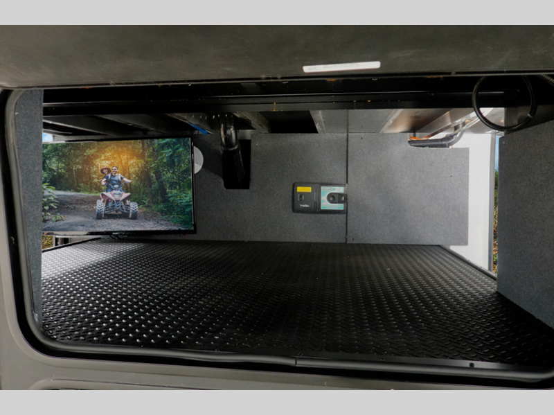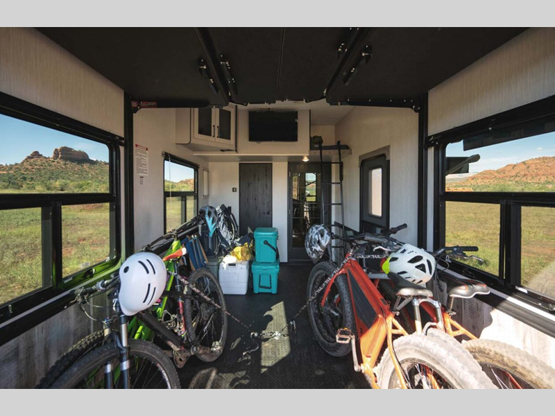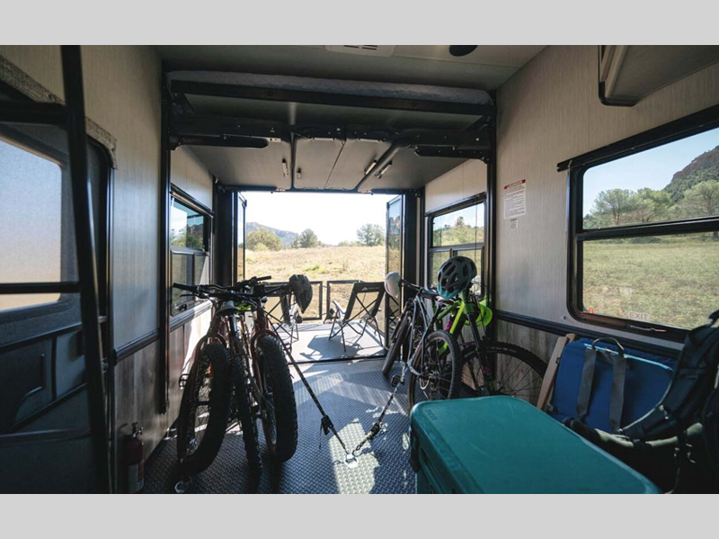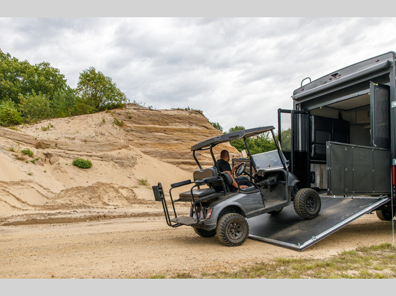 Some of the other top features that will catch your eye are the Step Caddy folding patio steps for better stability when entering and exiting, and the weather proof ramp door with a self-locking compression latch and space saving aluminum powder coated rail kit. The interior includes roller shades in the living room, high-quality overstuffed residential furniture, carpet-free slide outs, and many more at-home comforts. Your toys will stay secure during transport thanks to the steel D-ring tie downs, and the large 8' garage door ramp will make loading and unloading easier than ever.