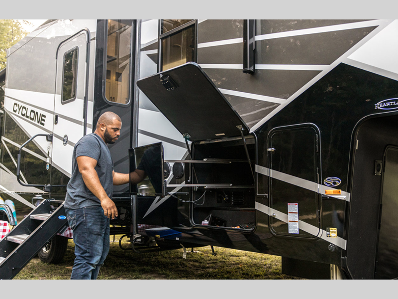 The Great Outdoors is yours for the taking in a Cyclone toy hauler fifth wheel by Heartland! These models are packed with high-end features, like the Store-More pass-through with 30% more storage, and they are built tough with Azdel fortified sidewall construction so you can camp for years to come!