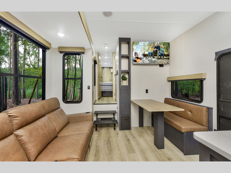 Some of the top exterior features are the anti-chucking Rota-flex 2" receiver hitch, the upgraded MORryde solid step with quick-adjust system at every door, and the alternative power provided by the Sol-380 that includes two 190 watt solar panels, a 30 amp controller, and a 2,000 watt inverter. You will also be impressed by the interior's residential features, such as a chef kitchen to cook meals for your crew each day plus a Smart TV with a JBL sound system to keep you entertained.