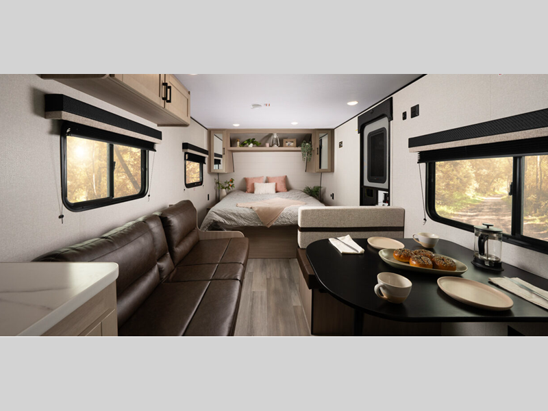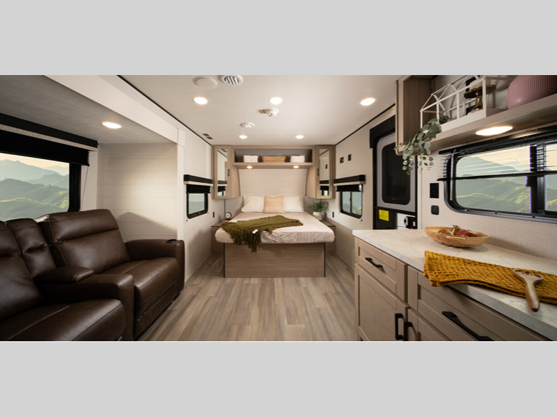 It will be effortless to enjoy time at the campground with interior comforts, such as vinyl flooring throughout, durable, residential-inspired kitchen countertops, and solid hardwood cabinet doors. The Camping in Comfort Package will add to each excursion with an on-demand tankless water heater, stabilizer jacks, marine grade exterior stereo speakers, and LED lights both inside and out!