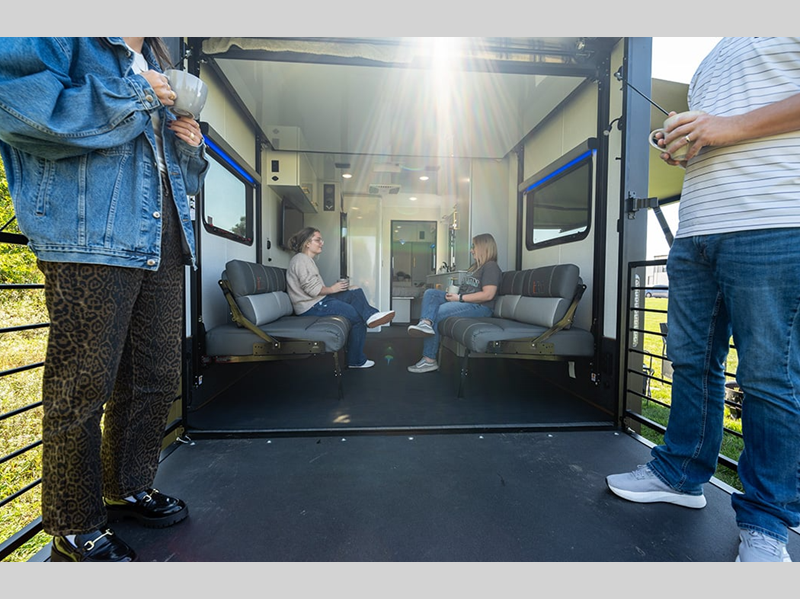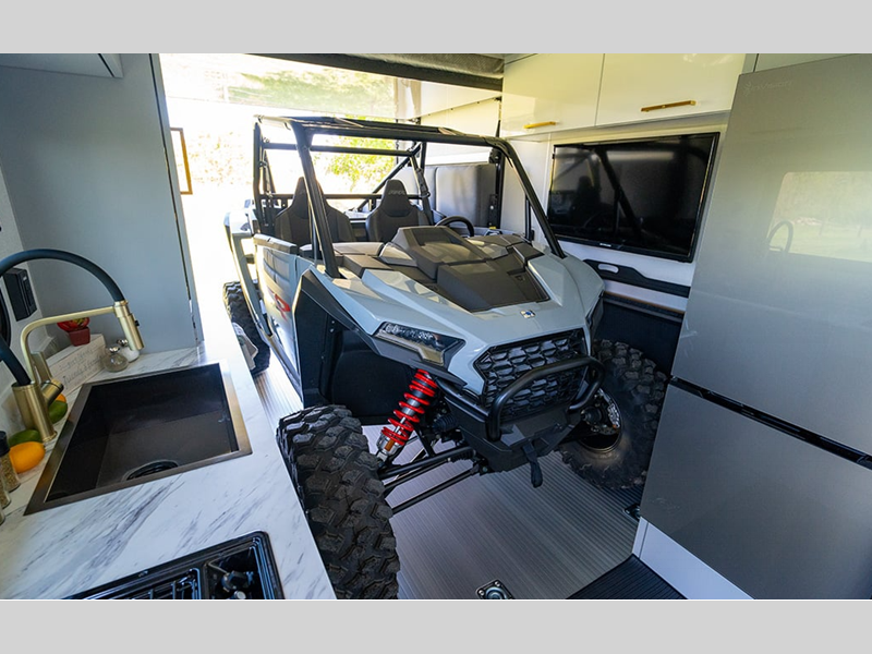 You'll find ample storage space inside and out for your personal belongings and riding gear, along with tie-down rings to keep your toys secure. The on-demand water heater will provide endless hot showers, and the optional Off-Grid Package can be added if you plan to go off the beaten path. Outside, you'll appreciate the power tongue jack, exterior lighting, and fold-away double entry step.