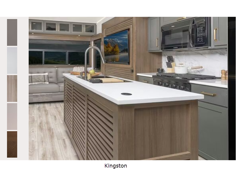 Sleeps 4 Slides 3 Length 33 ft 11 in Ext Width 0 ft Ext Height 13 ft 4 in Interior Color Kingston Hitch Weight 2255 lbs Dry Weight 12275 lbs Cargo Capacity 3980 lbs Fresh Water Capacity 77 gals Grey Water Capacity 100 gals Black Water Capacity 50 gals Furnace BTU 35000 btu Available Beds King Refrigerator Type 12V Refrigerator Size 16 cu ft Shower Size 30" x 48" Number of Awnings 2 Axle Weight 7000 lbs LP Tank Capacity 30 lbs Water Heater Type On Demand AC BTU 31500 btu TV Info LR 50" 4K Smart TV Awning Info Power w/LED Lights Axle Count 2 Washer/Dryer Available Yes Number of LP Tanks 2 Shower Type Standard Electrical Service 50 amp Similar Floorplans