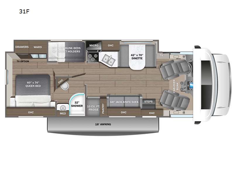 The whole family can travel together in this motorhome! The kiddos can sleep on the set of bunk beds and you can sleep on the 60" x 74" queen bed in the rear private bedroom. Everyone can easily access the dual entry bathroom to freshen up in the 32" radius shower each morning. Cook up delicious meals on the three burner cooktop, then head to the booth dinette which can also transform into an extra sleeping space. You can take an afternoon nap on the sofa or head outdoors to watch the big game at the exterior LED HD Smart TV underneath the 18' electric awning with LED lights to highlight the good times!