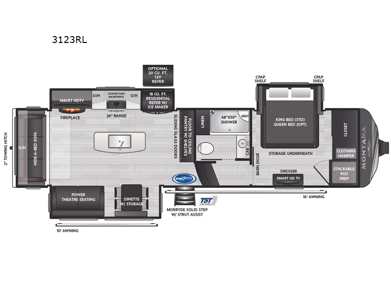 Enjoy luxury, innovation, and the outdoors in any one of Montana's finest fifth wheels. Each set the standard with exceptional features, and exciting factory installed options to provide you a great home on the road. Keystone's exclusive 12" I-beam chassis with z-frame technology has been reengineered to be stronger, lighter and built for "the long haul". A few other construction features you will appreciate include a Road Armor suspension, 2" thick, dual-layered lauan high gloss fiberglass sidewalls, a MaxTurn front cap with KeyShield automotive-grade paint, and a fully walkable roof with an Alpha seamless TPO membrane system. Each feature stylish interiors with two new decor choices paired with beautiful Manhattan Maple hand-glazed hardwood cabinetry, vinyl flooring throughout, central vacuum, plus a Blade Pure airflow system for clean, quite, and cool air!