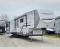 One look at this fifth wheel and you'll be sold! You can wake up each morning in the master bedroom that includes a custom king bed and a dresser with an ottoman. The front full bath has two bath sinks so you both can get ready at once, and you're going to love the walk-in wardrobe with a wrap-around hanging rod. A half bath includes a floating shelf with a hanging rod plus washer/dryer prep, giving you the option to make this a laundry room! The back of this unit is where you can cook meals with full kitchen amenities, dine at the kitchen island with four chairs, and relax on the theater seating and tri-fold sofa. A 50" TV and fireplace is also found here, complete with hidden storage behind for board games, movies, and snacks!