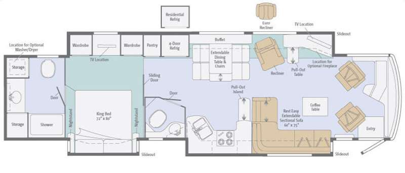 Ellipse Class A Diesel by Itasca w/1-1/2 Bath Including Rear Full Bath w/Shower, Storage Cabinet, Sink, Toilet, King Bed Slide w/Nightstands, Ward./Retractable 26" LCD TV/Ward./Pantry/4 Door Refrig./Dining Table & Chairs/Recliner/Pull-Out Table & 40" LCD TV Slideout, Rest Easy Extendable Sectional Sofa w/Coffee Table/3 Burner Range & Dbl. Kitchen Sink Slide, 1/2 Bath w/Vanity & Sink and More! Available Options May Include: Residential Refrig., Euro Recliner, Washer/Dryer, Fireplace.
