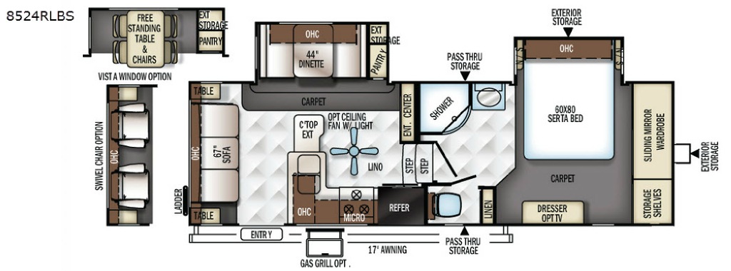 Outside you can choose an optional gas grill, as well as enjoy the shade of the 17' awning. The pass thru storage area and all of the exterior storage spots are great for all of your camping gear and more!