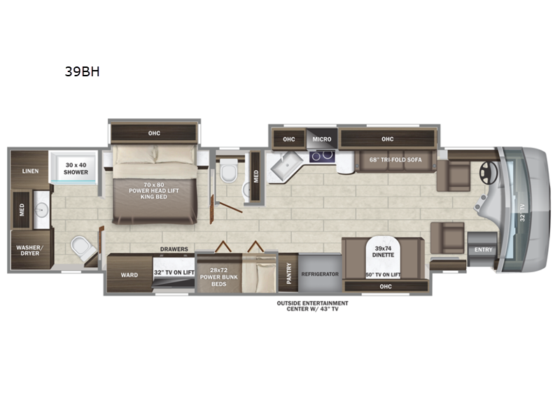 | TV Info | LR 50" 4K UHD Smart TV, Cab 32" LED Smart TV, BR 32" LED Smart TV, Exterior 43" 4K UHD Smart TV | Awning Info | Carefree Power with LED Lights |