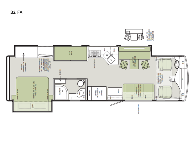 - Dinette with Computer Workstation with Lift TV on Driver Side (Optional 32 FA; N/A all other Models)